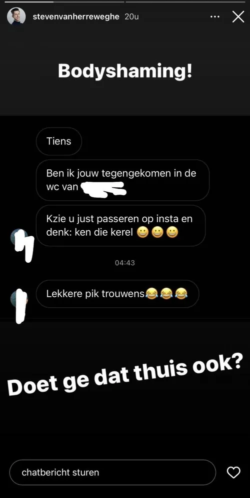 De man heeft ook nog een opmerking over het geslachtsdeel van Steven. “Lekkere pik trouwens”, schrijft hij met enkele lachende smileys. Steven vraagt zich het volgende af: “Doe je dat thuis ook?”. Ook deelt hij ook nog zijn mening over het voorval. “Bodyshaming!”, schrijft hij.