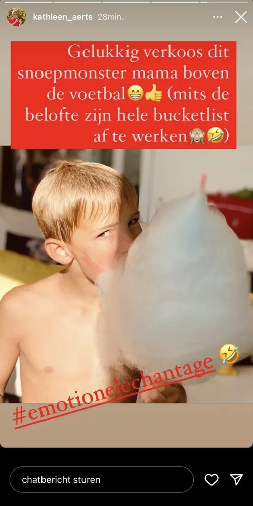 Gelukkig blijft zij niet alleen achter in Zuid-Afrika. Haar jongste zoon Jay houdt haar gezelschap. “Gelukkig verkoos dit snotmonster mama boven de voetbal”, schrijft ze. Al staat daar wel wat tegenover. “Mits de belofte zijn hele bucketlist af te werken. Emotionele chantage”, zegt ze al lachend.