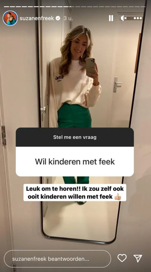Tijdens een vragenronde op Instagram kreeg Suzan een wel heel bijzonder berichtje binnen. “Wil kinderen met Freek”, stuurde iemand in. Wat waarschijnlijk gewoon een typfout was en een vraag moest voorstellen, zet Suzan meteen om in een mopje. “Leuk om te horen”, grapt ze. Niettemin is haar volgende antwoord zo klaar als een klontje. “Ik zou zelf ook ooit kinderen willen met Freek”, vult zijn wederhelft aan.