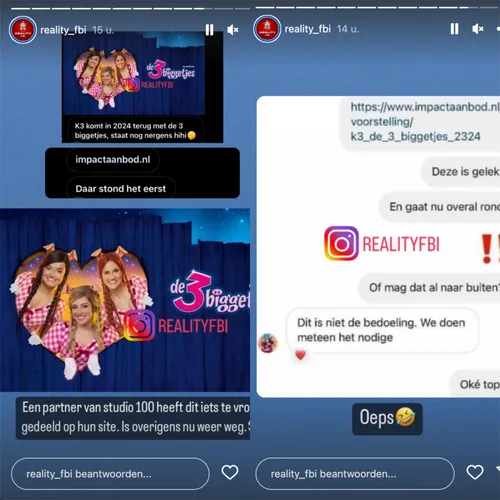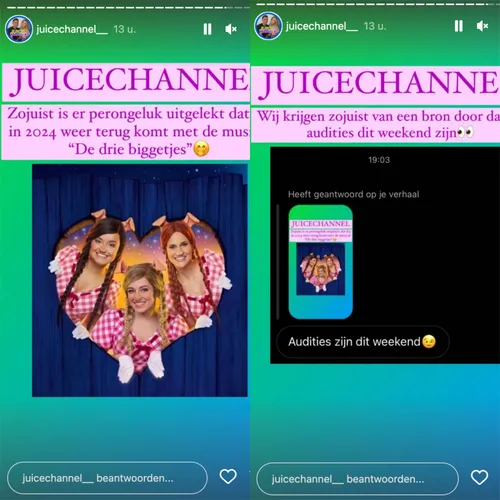 Volgens het Nederlandse roddelkanaal Juicechannel zullen de meisjes van K3 de musical in 2024 hernemen en vinden de audities dit weekend al plaats. Reality FBI, nog een ander juicekanaal, kreeg het officiële Instagramaccount van K3 te pakken. “Dit is niet de bedoeling. We doen meteen het nodige”, klinkt hun reactie.