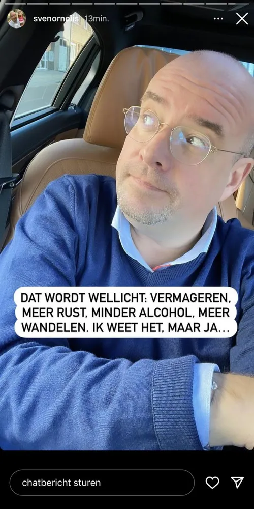 Toch weet hij eigenlijk al wat er aan de hand is. “Dat wordt wellicht vermageren, meer rust, minder alcohol, meer wandelen”, schrijft hij. “Ik weet het, maar ja”, sluit hij af.