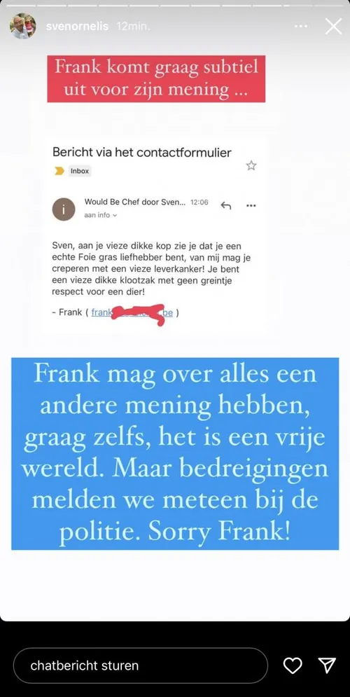 Sven Ornelis is niet alleen radiopresentator bij Joe, hij heeft ook een eigen blog. Daarop schrijft hij onder andere over eten, drinken en sporten. Zopas kreeg hij niet zo’n leuk mailtje binnen na een nieuwe blogpost. “Frank komt graag subtiel uit voor zijn mening…”, schrijft een misnoegde Sven op zijn Instagramverhaal.