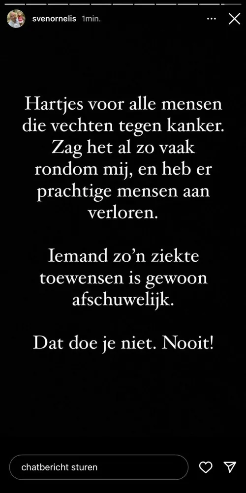 Zo laat Sven weten dat hij zulke boodschappen niet tolereert. “Bedreigingen melden we meteen bij de politie. Sorry Frank!”, klinkt het. Verder neemt hij het ook op voor mensen die vechten tegen kanker. “Iemand zo’n ziekte toewensen is gewoon afschuwelijk. Dat doe je niet. Nooit!”, besluit de radiopresentator.