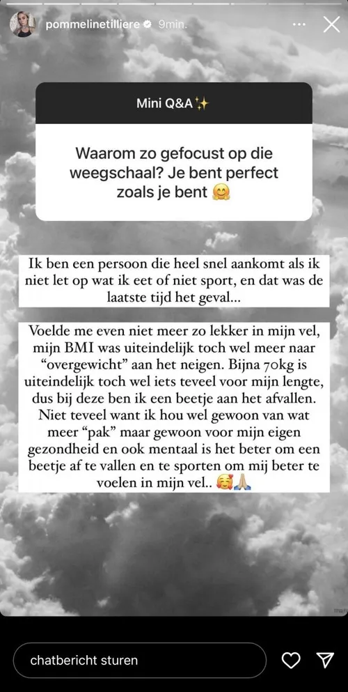Pommeline Tillière, die we nog kennen van ‘Temptation Island’, laat in haar ziel kijken. Tijdens een vragenrondje krijgt ze een opvallende vraag van één van haar volgers. “Waarom zo gefocust op die weegschaal?”, klinkt het. “Ik ben een persoon die heel snel aankomt als ik niet let op wat ik eet of niet sport, en dat was de laatste tijd het geval”, begint ze.