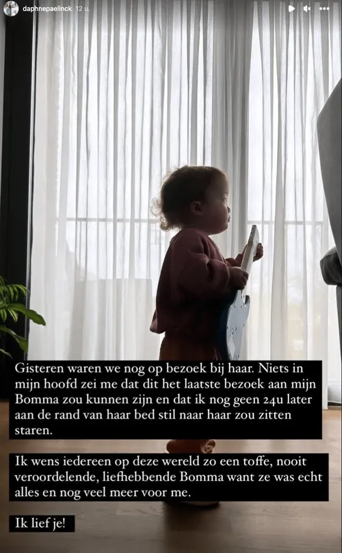 “Gisteren waren we nog op bezoek bij haar”, schreef ze zaterdag op haar Instagramverhaal. “Niets in mijn hoofd zei me dat dit wel eens het laatste bezoek aan mijn bomma zou kunnen zijn en dat ik nog geen 24 uur later aan de rand van haar bed stil naar haar zou zitten staren.” Het overlijden van haar bomma kwam bij Daphne enorm hard aan.