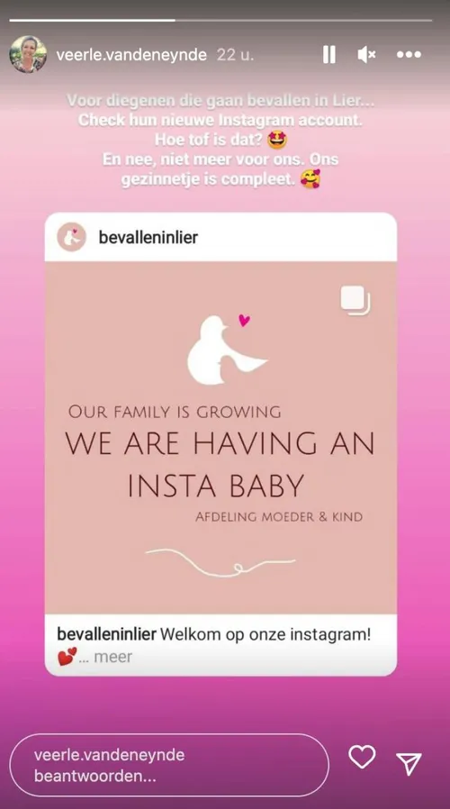 Op haar Instagramverhaal deelt Veerle nu een bericht van ‘Bevallen in Lier’, een Instagramprofiel dat een kijkje geeft achter de schermen van de moeder-en-kindafdeling in het Heilig Hart Ziekenhuis van Lier. “We are having an insta baby”, staat er in koeien van letters op haar verhaal. Op het eerste gezicht leek het alsof Veerle opnieuw een zwangerschap aankondigde. Maar niets is minder waar.
