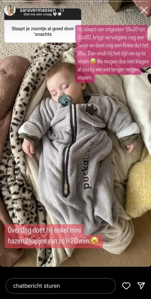 “Hij slaapt van ongeveer 22u30 tot 1u, krijgt vervolgens nog een flesje en doet een flinke dut tot 5u”, vertelt ze. Sara moet dan wel vroeg uit de veren, maar dat vindt ze niet heel erg. “We mogen dus niet klagen, al zou hij wel wat langer mogen slapen”, geeft ze toe. “Overdag doet hij enkel mini hazenslaapjes van zo’n 20 minuten”, klinkt het.