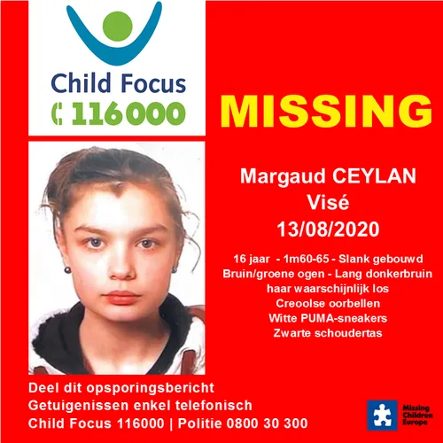 Wie Margaud gezien heeft, of weet waar ze zich bevindt, wordt gevraagd om contact op te nemen met de politie op het nummer 0800 30 300. Child Focus kan telefonisch bereikt worden op het nummer 116 000.