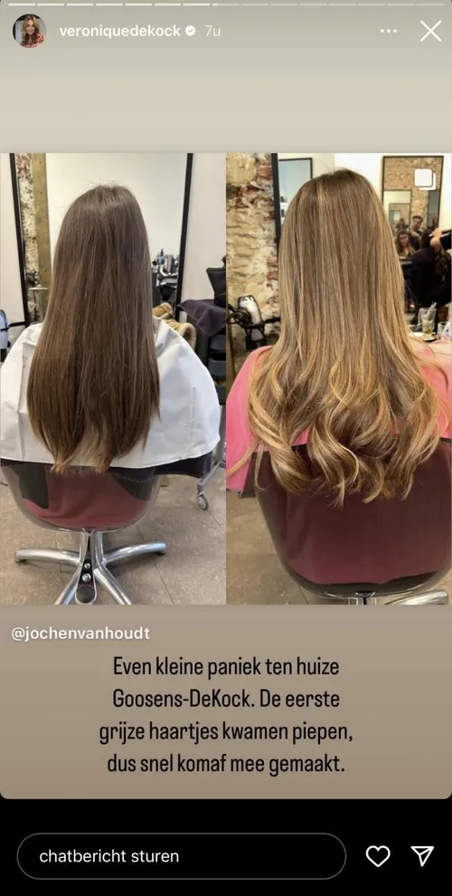 Tegen ouder worden kan je niets doen, maar je kan wel je grijze haren verstoppen. Dat was Véronique dan ook direct van plan. “Dus snel komaf mee gemaakt”, vertelt ze. Ze maakte meteen een afspraak bij de kapper en na wat haarverf is er geen grijze lok meer te bespeuren. Het resultaat showt ze nu maar al te graag op haar Instagramverhaal.