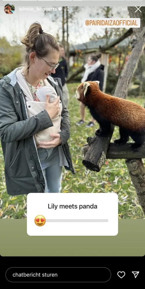 “Vandaag met ons drietjes op uitstap in Pairi Daiza”, schrijft mama Winnie op haar Instagramverhaal. Ze deelt verschillende beelden van het park, maar wat meteen opvalt zijn de mooie kiekjes van de kleine spruit. Zo mocht Lily bijvoorbeeld de rode panda’s van heel dichtbij ontmoeten. Op het plaatje zit ze in de draagzak van haar mama.