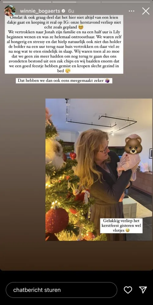 “Omdat ik ook graag deel dat het hier niet altijd van een leien dakje gaat en keeping it real on Instagram. Onze kerstavond verliep niet echt zoals gepland”, biecht ze op. “We vertrokken naar de familie van Jonah en na een halfuur is Lily beginnen wenen en was ze helemaal ontroostbaar”, klinkt het. “We waren zelf al hongerig en stressy en dat hielp natuurlijk ook niet. Dus holderdebolder na een uur terug naar huis vertrokken en daar viel ze na nog wat te eten eindelijk in slaap”, legt de mama uit.