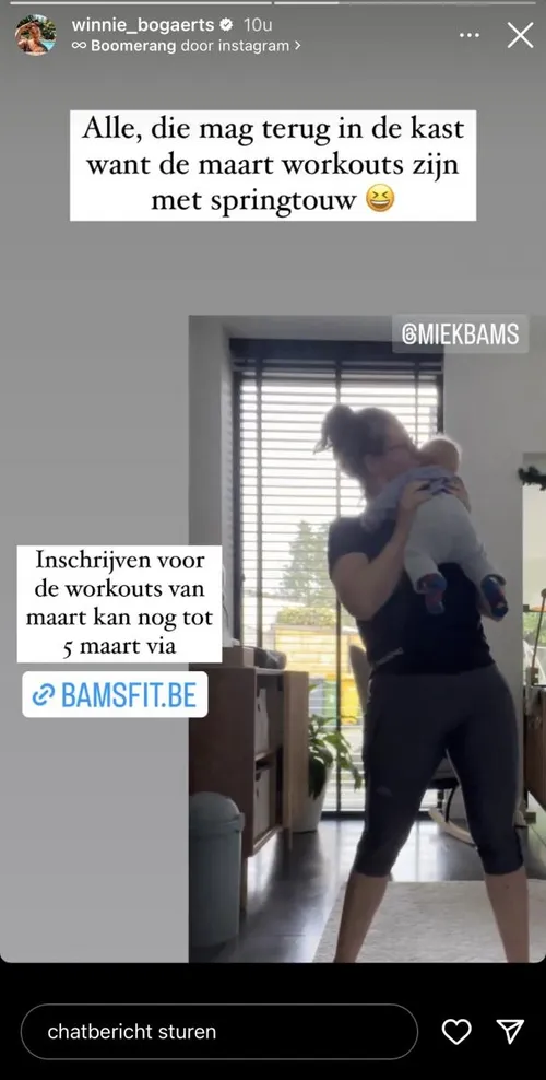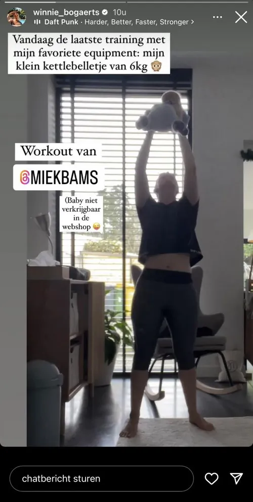 Om terug fit te worden na de zwangerschap doet Winnie sinds kort verschillende work-outs thuis. Daar laat ze nu meer van zien op haar Instagramverhaal, maar ze gebruikt wel een erg bijzonder attribuut voor haar sportoefening. “Vandaag de laatste training met mijn favoriete equipment: mijn klein kettlebelletje van zes kilogram”, klinkt het.