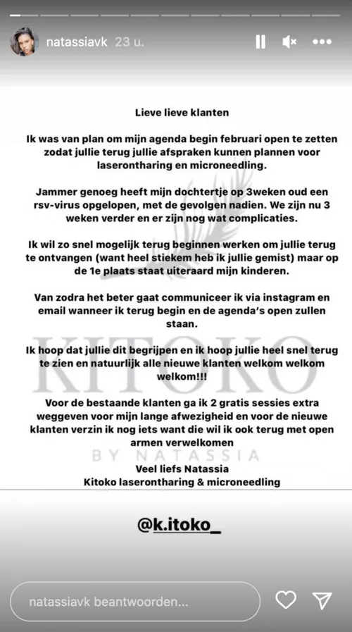 Maar nu moet de kersverse mama opnieuw slecht nieuws melden. “Lieve klanten, ik was van plan om mijn agenda begin februari weer open te zetten zodat jullie weer afspraken konden plannen voor laserontharing en microneedling. Jammer genoeg heeft mijn dochtertje na drie weken RSV opgelopen, met de gevolgen van dien. We zijn nu drie weken verder en er zijn nog wat complicaties”, laat de schoonheidsspecialiste weten op haar Instagramverhaal.