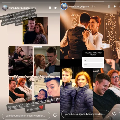 Yanni deelt het bericht op zijn beurt op zijn verhaal. “Dat is nu wel juist, ja”, moet de acteur beamen. “Ik denk niet dat er twee acteurs zijn die al meer gezaagd hebben bij de schrijvers om weer lief te mogen zijn tegen elkaar”, lacht hij. “Sandrine, de mooiste en liefste tv-mama”, besluit hij. Of de fans weer meer scènes tussen Cédric en Veronique willen? Yanni’s volgers antwoorden volmondig ja.