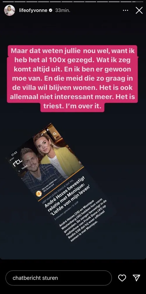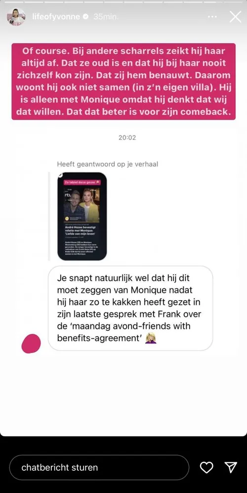 Eén van haar volgers stelt dat André dit waarschijnlijk moest zeggen van Monique. “Natuurlijk”, reageert Yvonne meteen. “Bij andere scharrels zeikt hij haar altijd af. Dat ze oud is en dat hij bij haar nooit zichzelf kan zijn. Dat zij hem benauwt”, klinkt het. Daarom woont hij volgens Yvonne ook niet samen met Monique. “Hij is alleen met Monique omdat hij denkt dat wij dat willen. Dat dat beter is voor zijn comeback”, onderstreept ze.
