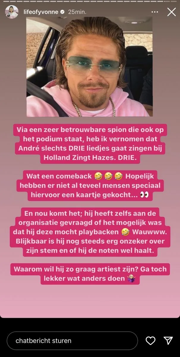 Yvonne Coldeweijer verklapt nu dat die comeback helemaal niet zo groot zal zijn. “Via een zeer betrouwbare spion die ook op het podium staat, heb ik vernomen dat André slechts drie liedjes gaat zingen bij ‘Holland Zingt Hazes’”, schrijft ze op haar Instagramverhaal. “Wat een comeback. Hopelijk hebben er niet al te veel mensen speciaal hiervoor een kaartje gekocht”, lacht ze.