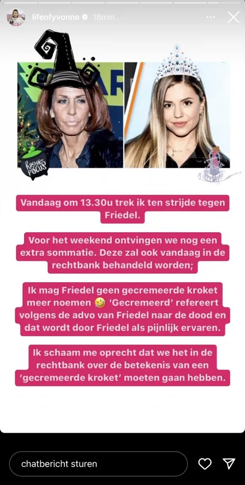 “Vandaag om 13u30 trek ik ten strijde tegen Friedel”, begint de Nederlandse roddeltante op haar Instagramverhaal. Yvonne zal in de rechtbank meer moeten vertellen over de ‘briefgate’. Coldeweijer onthulde eerder namelijk dat zij een brief had ontvangen die André Hazes had geschreven voor zijn ex-vriendin Sarah van Soelen.