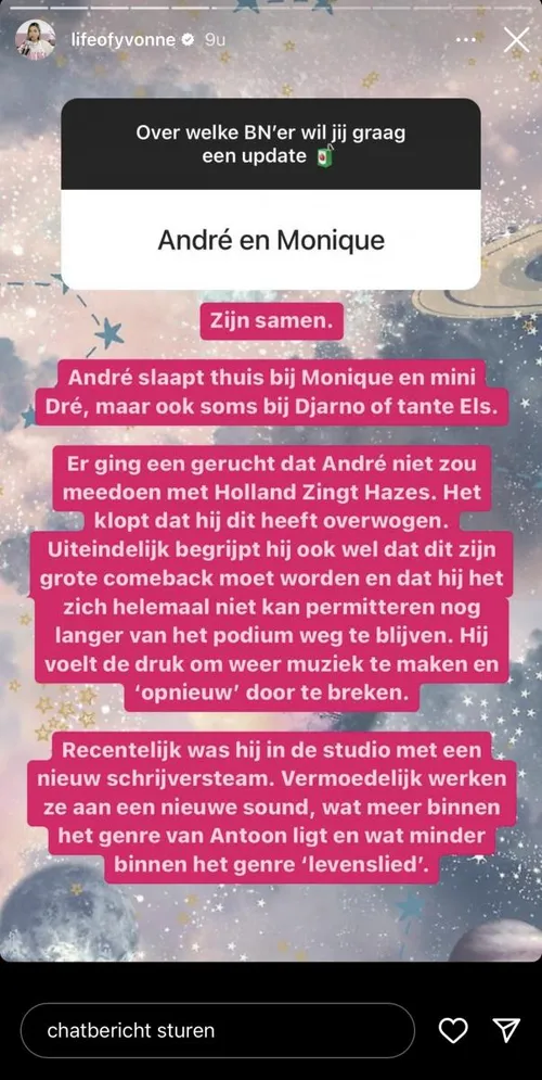 De bekendste roddeltante van Nederland vroeg op haar Instagrampagina aan haar volgers over welke bekende Nederlander ze graag een juice-update willen. “André en Monique”, klonk het meermaals in haar inbox. Velen zijn namelijk erg geïnteresseerd in het liefdesleven van André, zeker nu het gerucht de ronde gaat dat hij Monique Westenberg opnieuw ten huwelijk gevraagd zou hebben.