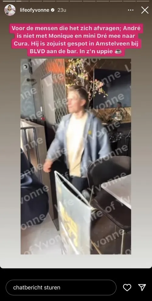 Monique en hun zoontje Dré vertoeven momenteel in Curaçao, maar André is niet mee op reis vertrokken. “Voor de mensen die het zich afvroegen: André is niet met Monique en mini Dré mee naar Curaçao”, aldus de roddeltante. “Hij is zojuist gespot in Amstelveen bij BLVD aan de bar, in z’n uppie”, klinkt het.