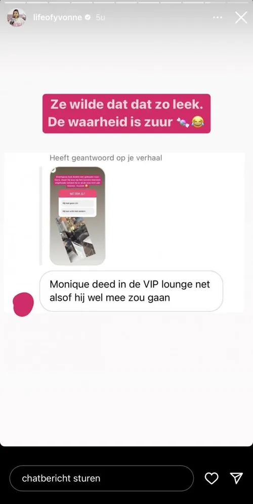 “Overigens had André wel geboekt naar Curaçao, maar hij was op het laatste moment afgehaakt omdat hij te druk was met zijn nieuwe muziek”, legt ze uit. “Monique deed in de VIP-lounge net alsof hij wel mee zou gaan”, vertelt een volger aan Yvonne. “Ze wilde dat dat zo leek”, reageert Coldeweijer. “De waarheid is zuur”, zegt ze al lachend.